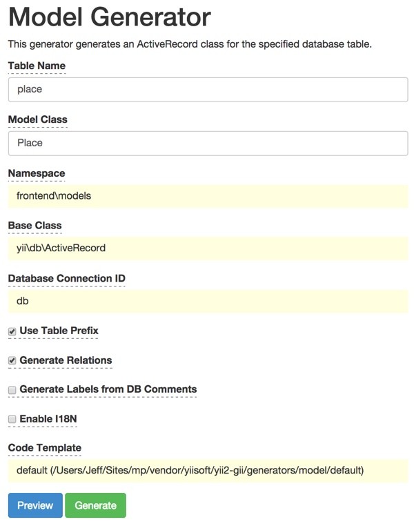 When building with Gii, you generally start with the Model Generator for each table. Before you can use the Model Generator, you have to have run your migrations to create the tables in the database, as we did above. Gii uses the SQL table definitions to generate code for your Model.
