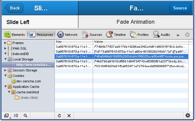 When first viewing the page, the browser makes a request for a CSS file. Refreshing the page feels a lot snappier because Sencha stored the CSS in local storage. The kitchen sink app has some interesting key/value pairs. For example, one key looks like this: