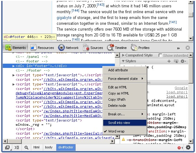 Naturally, we do not see elements outside of the browser's viewport highlighted when hovering over the corresponding elements in the Elements pane. Fortunately, we do see a tooltip indicating the direction of the out-of-viewport element. The icing on the cake, however, is the Scroll into view feature found within an element's context menu. It does exactly what its says: it scrolls the element into view.