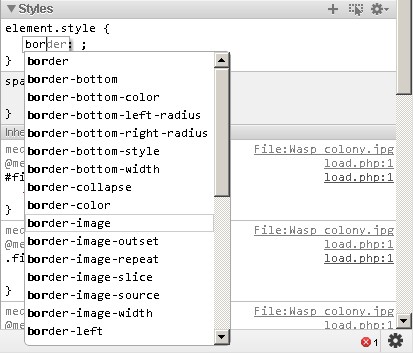 When you start typing in the property name, Chrome provides suggestions, giving you the benefit of auto-completion. Awesome! Pressing tab selects the closest match to what you typed and moves the cursor to the value position. However, pressing the right arrow key causes the cursor to remain in the property portion but fills in the closest match to what you typed.