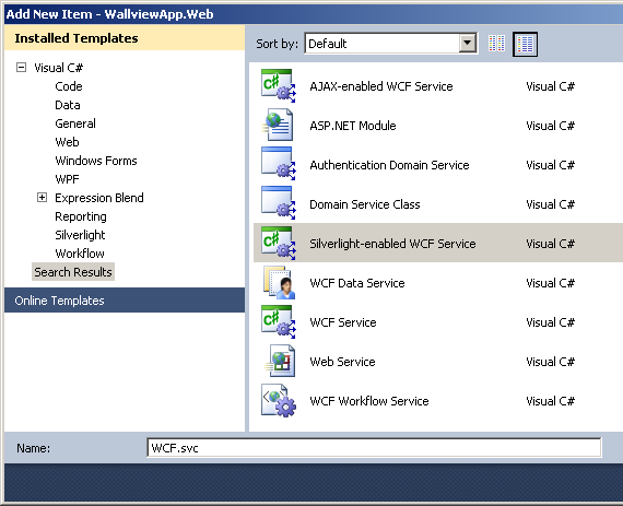 From the popup select "Silverlight-enabled WCF Service Visual C#" and enter "WCF.svc" for a name, then click "Add":