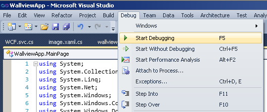 In order to be able to use the webservice we need to add a Service Reference to the main project. Before we can successfully do this we have to build the project once. Therefore click on "Build" from the menu at the very top of Visual Studio and after that on "Build WallviewApp":