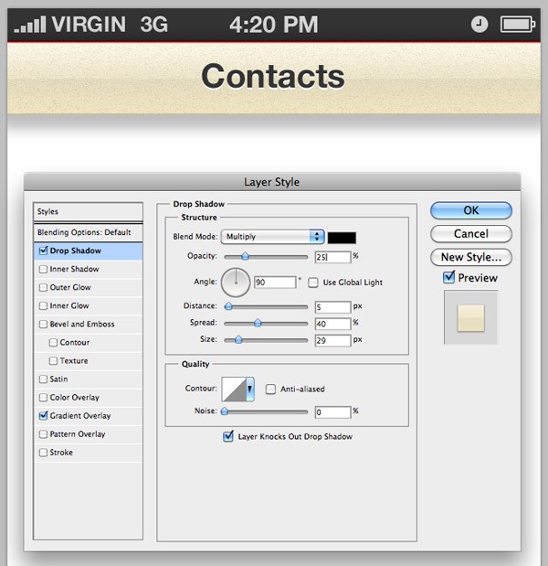 Open up the Layer Style window for your title bars background layer once again, and select the Drop Shadow tab. Change the opacity to 25%, the distance to 5px, spread to 40%, and size to 29px. Make sure the angle is set to 90 degrees and then click OK. This will add a drop shadow beneath your bar, which will look great once we add a background to our design.