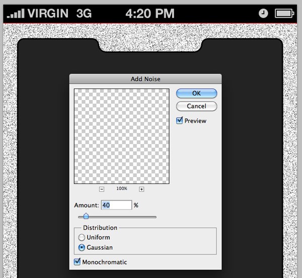 Make a selection of your screen by clicking on the preview thumbnail in the Layers Panel whilst holding the Cmd-Key. Create a new layer above your shape layer and fill your selection with black using the Paint Bucket Tool. Go to Filter > Noise > Add Noise and add around 20% noise. Click OK. Drop the opacity of the layer to around 15%.