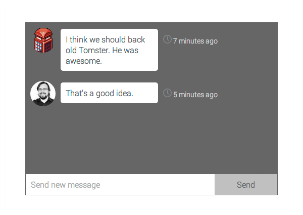 One really nice thing about Ember is that it's built on concepts of UI hierarchy and this is very apparent with composition of components. Below is an example of what we are going to make. It's a simple group chat UI. Obviously, I'm not going to write a whole chat service to power the UI, but we can see how we can break the UI down into re-usable and compose able components.
