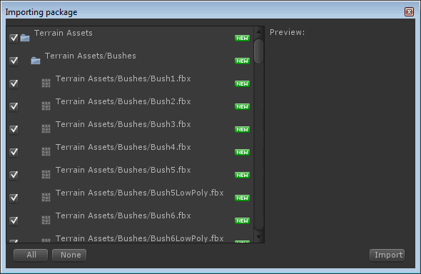 When the download is complete Unity will list the contents of the package, as shown below, allowing you to select only the Assets that you wish to import. Simply click 'Import' so we have it all available to us.