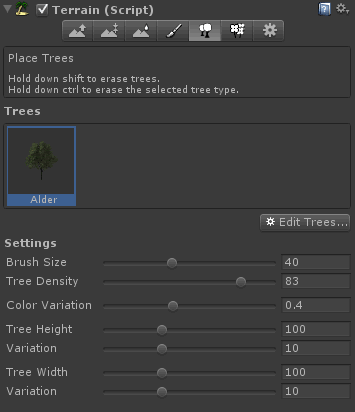 You'll notice there are quite a few more settings this time such as 'Tree Density' which controls the percentage of trees within the brush area and 'Tree Height / Width Variation' which will make your trees look a little less identical by randomizing the width / height of the trees you place.