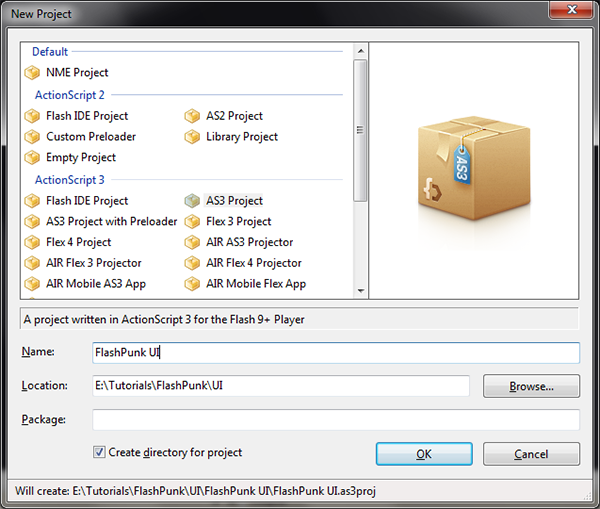 Choose ActionScript 3 > AS3 Project. For the name of the project, put in "FlashPunk UI". For the location, click and navigate to the folder you would like to save it into. Leave the "create directory for project" checkbox selected and click OK.