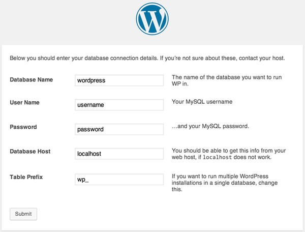 Fill out the database information that WordPress requests using your choices above. The process will look something like this:
