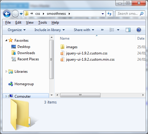 | css | Production release versions of jQuery UI CSS files. For this tutorial, we're using the smoothness theme. |