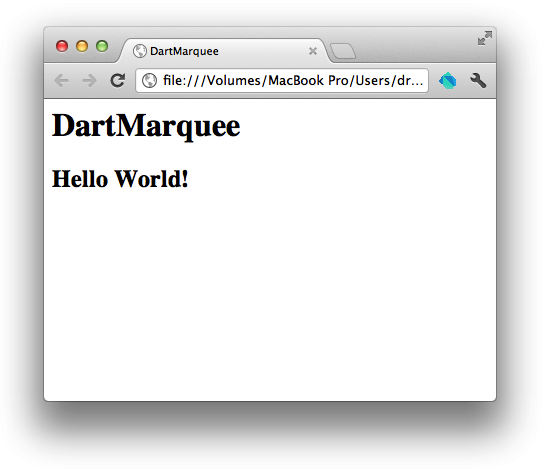 Now run the project again, but this time be sure to do it by clicking and holding on the Run tool bar button, and then selecting your new launch target. You should now get the same Hello World application in the browser of your choosing, which will be using JavaScript compiled from Dart. In fact, you'll see a new file show up in your file list: DartMarquee.dart.js. This is the compiled JavaScript file.