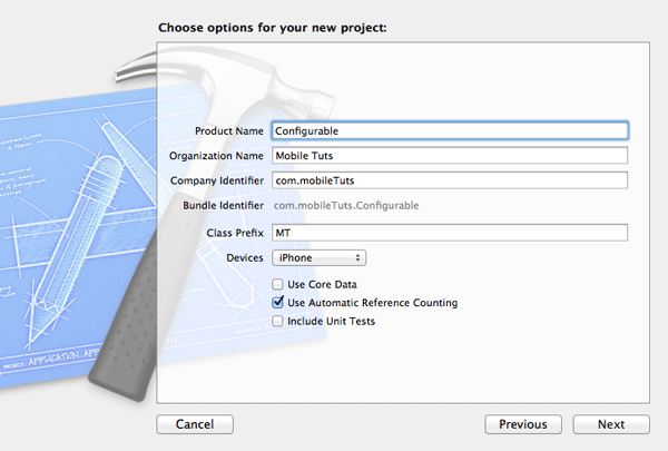 Create a new project in Xcode by selecting the Empty Application template from the list of templates (figure 1). Name your application Configurable, enter a company identifier, set iPhone for the device family, and check Use Automatic Reference Counting. The rest of the checkboxes can be left unchecked for this project (figure 2). Tell Xcode where you want to save the project and click Create.