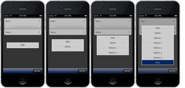 Finally, we just need to implement the -(void)userSelectedOptionWithIndex:(NSUInteger)index delegate method. This is where any actions are taken when the user taps on the menu options.