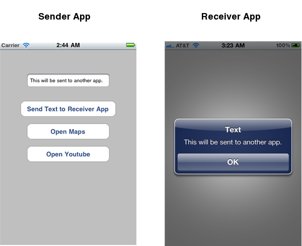 These methods are using the openURL method of the UIApplication to send data to other apps. Apple has registered the Maps application and YouTube application with “http://" essentially, so we simply call openURL on those URLs. To create our URL, we also used the stringByAddingPercentEscapesUsingEncoding: method to ensure the string is a valid URL by URL encoding the string (we will decode it in our Receiver app). For our custom URL “readtext://" we first check if the link can be opened with canOpenURL. This essentially checks whether the app that is registered to that particular URL scheme is installed, and if it is, we are able to open the URL with our text. If the app is not installed, we display an error message. Remember that when you release your app to the public, the URL scheme your app is dependent on might not work because the other app isn't installed. You should always perform the canOpenURL when opening non-http:// URL schemes.