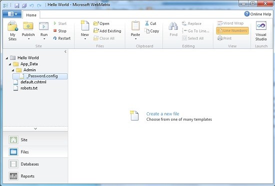 - Right-click the Hello World folder for your site and then click Refresh. The list of files and folders now displays an App_Data folder. Open that and you see an Admin folder. The newly created password file (_Password.config) is displayed in the ./App_Data/Admin/ folder. The following illustration shows the updated file structure with the password file selected: