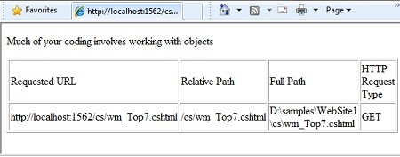 You'll often work with the Request object, which gives you information like the values of form fields on the page (text boxes, etc.), what type of browser made the request, the URL of the page, the user identity, etc. This example shows how to access properties of the Request object and how to call the MapPath method of the Request object, which gives you the absolute path of the page on the server: