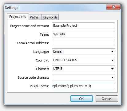 Once POEdit is installed, you can create your .pot file. To do this, go to File > New Catalog. You will be presented with a dialog box where you need to enter some basic information. The essentials in the "Project Info" tab are the project name and your language/country. You also must enter the following in the "Plural Forms" box: