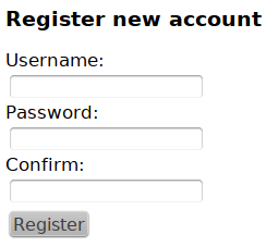 <!DOCTYPE html> <html> <head> <title>User Registration</title> <meta charset="UTF-8"> </head> <body> <h3>Register new account</h3> <form> Username: <br/> <input type="text" /> <br/> Password: <br/> <input type="password" /> <br/> Confirm: <br/> <input type="password" /> <br/> <input type="submit" name="register" value="Register"> </form> </body> </html>