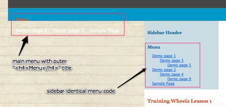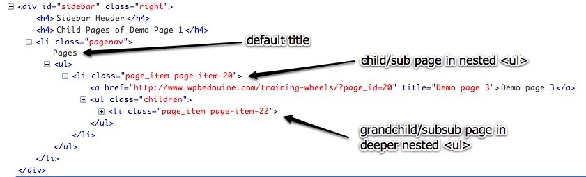 You will notice around the entire menu, there's an outer li item being added, with the Word Pages in it as a title to the entire menu. While this might work for a sidebar widget, telling the viewer that these links are pages, it's generally not something we want in the main page menu, especially not in a horizontal menu like the one we have in training wheels just below the header.