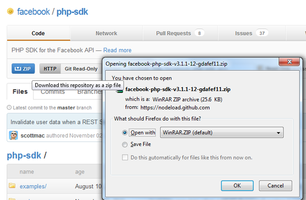 Point your browser to https://github.com/facebook/php-sdk and click on the “ZIP” button. This should prompt a download for the latest version of the SDK. Save it anywhere you like.